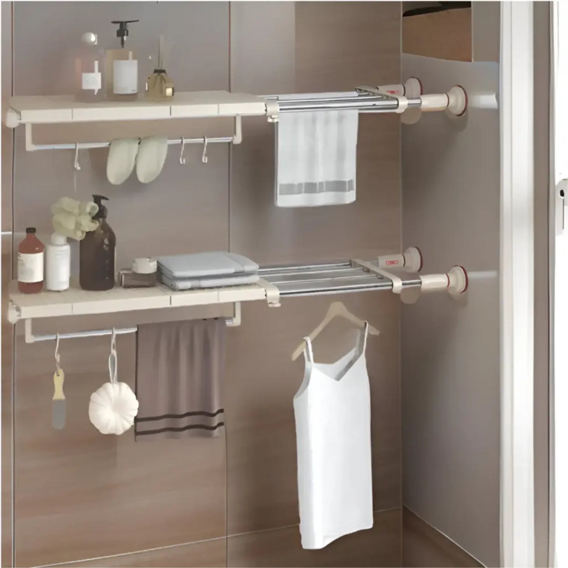 Podesiva teleskopska polica sa vakuumskim držačima je idealno rešenje za organizaciju prostora u kupatilu, kuhinji ili garderoberu – bez bušenja i dodatnog alata. Zahvaljujući pametnom dizajnu sa sistemom napetosti, polica se lako montira između zidova i pruža stabilno i sigurno odlaganje.